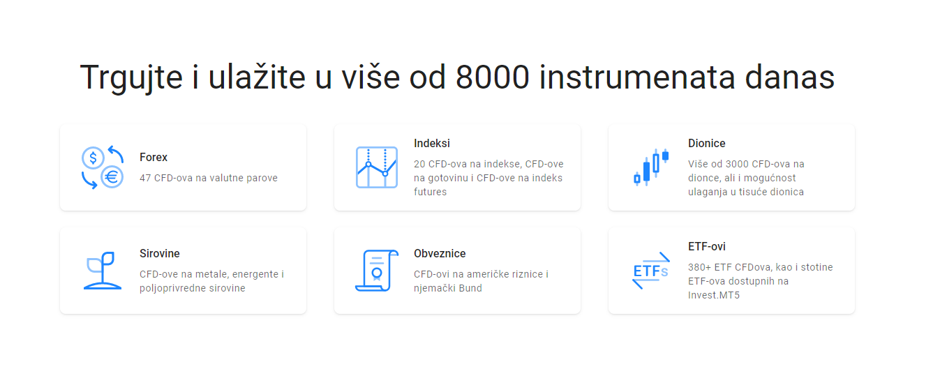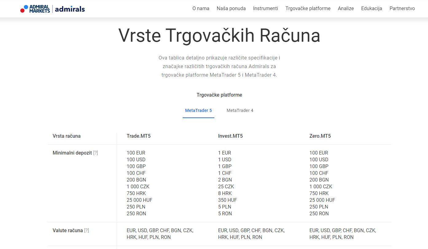 • Najpopularniji među je Admiras.Markets račun koji se od svog MT5 brata blizanca ne razlikuje po ničemu osim platformi. Za samo 10€ dobijete pristup preko 30 valutnih parova, 5 glavnih kriptovaluta te preko 90 CFD-a na različite proizvode.