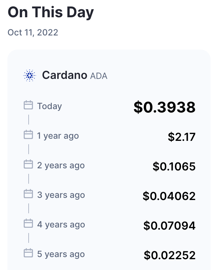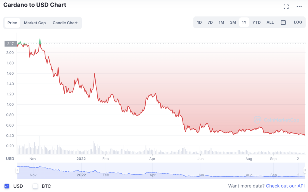 Cena mince Cardano byla v lednu 2022 1,37 dolaru a v říjnu 2022 je nyní 0,42 dolaru. Cardano za posledních dvanáct měsíců ztratilo 751 TP2T své původní hodnoty.