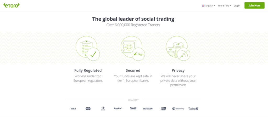 Zelo pomembna stvar pri spletnem trgovanju so vsekakor načini plačevanja in izplačila in eToro je poskrbel, da je tudi na tem področju v vrhu. Trgovcem ponuja več možnosti pologa prek bančnega računa, GiroPay, kreditne kartice, PayPal, Neteller, WebMoney in Skrill. Vse transakcije so varne 100% in uporabljajo najsodobnejšo tehnologijo SSL za obdelavo plačil in dvigov. Čas obdelave traja le 1 delovni dan, prejem plačila pa se lahko razlikuje glede na druge posrednike, ki jih uporabljate.